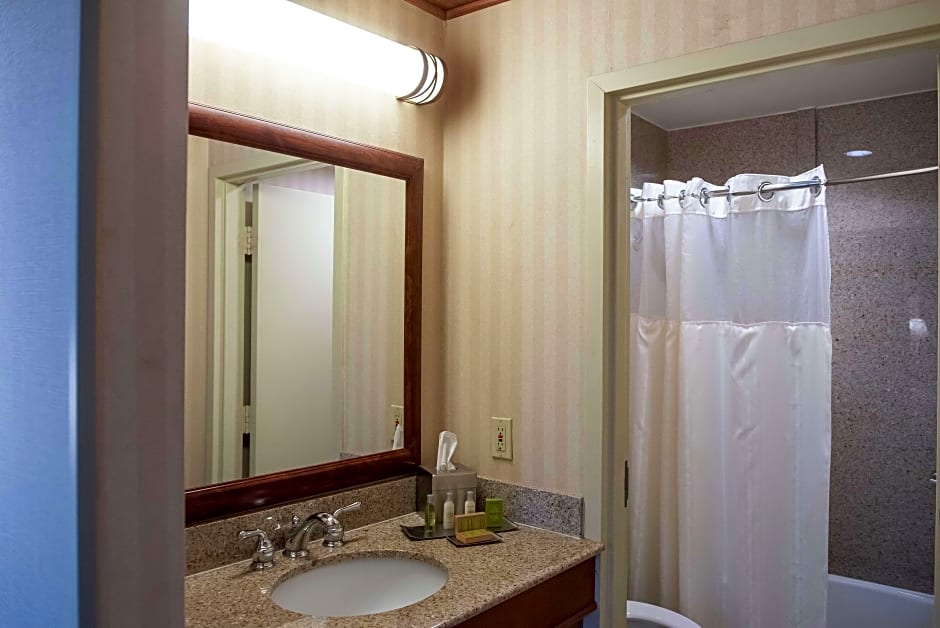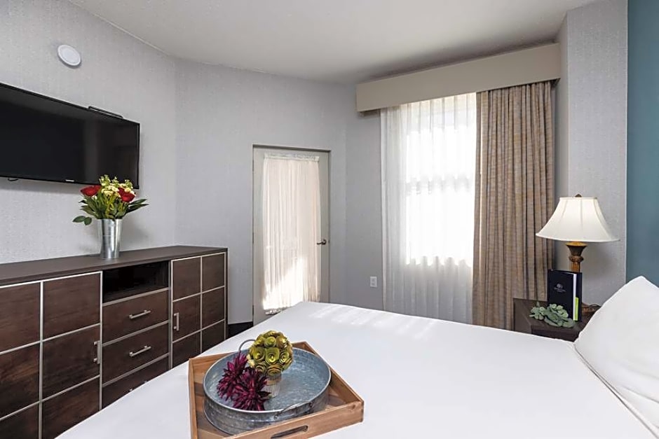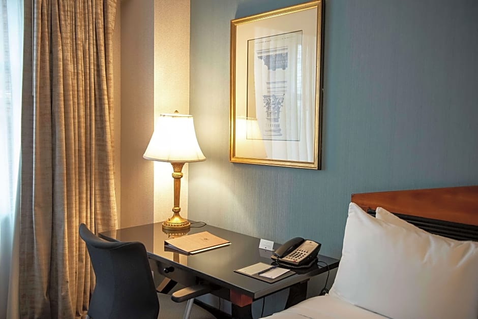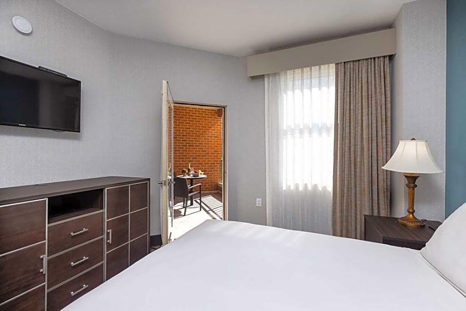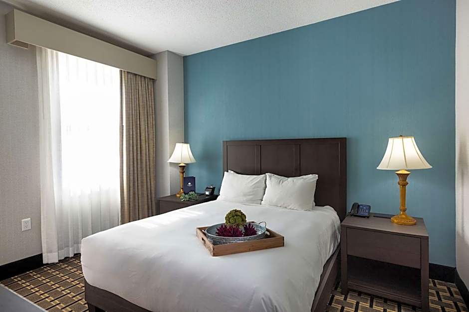 Sitting area, sofa bed, complimentary WiFi, 37-inch TV, refrigerator, microwave, whirlpool This stylish suite, with large opening windows, features a sitting area with a sofa bed and a bedroom with one queen-sized bed. The suite boasts 9 ft. ceilings and an open plan layout for added space and comfort. Revitalize in the marble bathroom with a whirlpool tub, refreshing bath products and plush robes. Watch on-demand movies and premium TV channels on the 37-inch HDTV or catch up on work at the writing desk. Complimentary WiFi access is available throughout the hotel. Additional features include a microwave, a refrigerator, a coffeemaker and a DoubleTree Alarm Clock with MP3 connection.