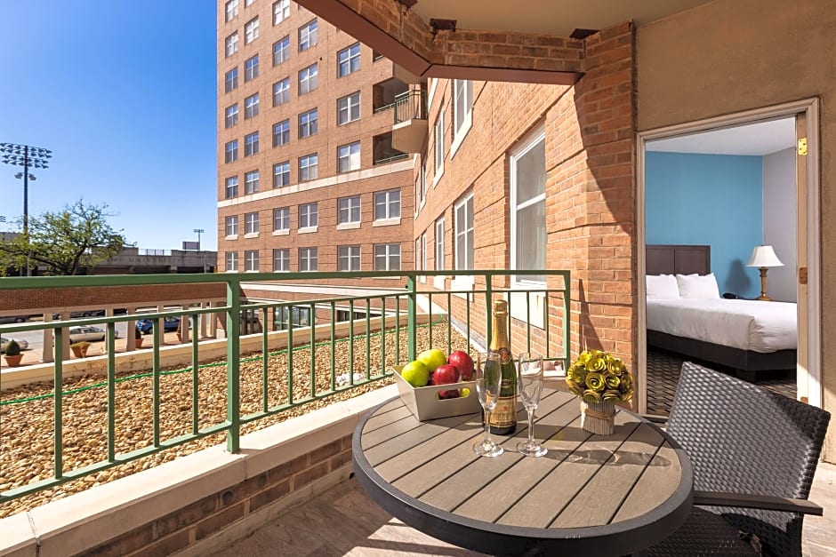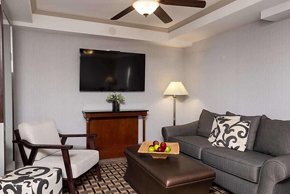 Balcony, dining area, living room, complimentary WiFi, 2 37-inch TVs, refrigerator, whirlpool This classic suite, with large opening windows, features a living room with a queen-sized sofa bed and a bedroom with one king-sized bed. Unwind on your own private balcony or refresh in the marble bathroom with a whirlpool tub, indulgent bath amenities and cozy bathrobes. Watch on-demand movies and premium TV channels on two 37-inch HDTVs, in the living room and bedroom, or entertain guests in the dining area. Complimentary WiFi access is available throughout the hotel. Additional features include a microwave, a refrigerator, a coffeemaker and a DoubleTree Alarm Clock with MP3 connection.