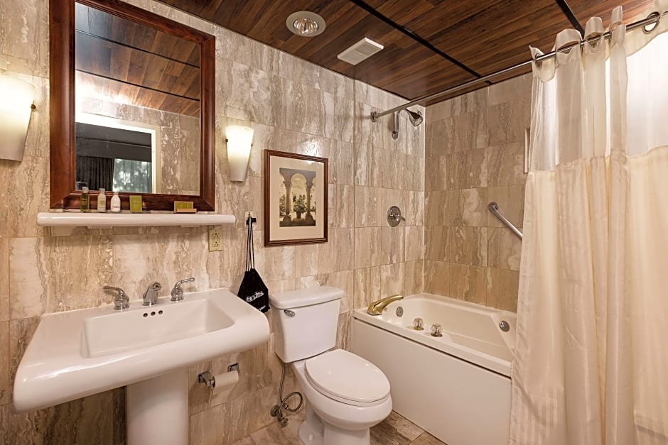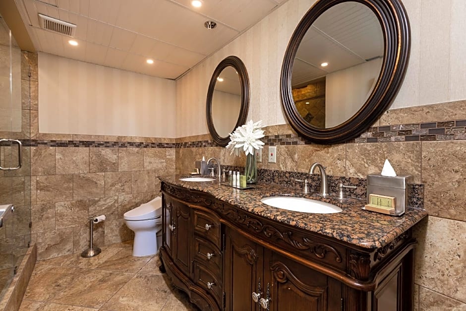 Courtyard view, sitting area, complimentary WiFi, refrigerator, microwave, whirlpool tub Our charming Honeymoon Suite, with one king-sized bed, boasts 9 ft. ceilings, an open plan layout and picturesque views of the back courtyard. Relax in the comfortable sitting area, enjoy on-demand movies and premium TV channels on two HDTVs or unwind in the whirlpool tub. The marble bathroom features a glass-enclosed shower, a bidet, indulgent bath amenities and plush bathrobes. Additional amenities include complimentary WiFi, a coffeemaker, a DoubleTree Alarm Clock with MP3 connection, a microwave and a refrigerator.